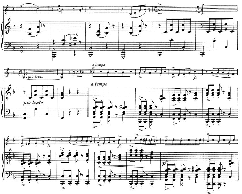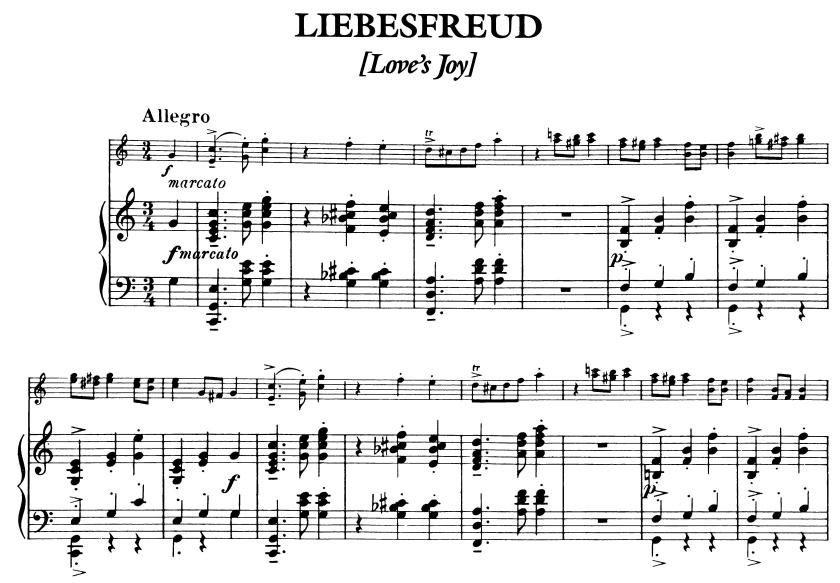 シュトラウスのワルツにもあったように、上記の『愛の喜び』も3部構成で、細かく分けてワルツが3つ存在します。1つ目のワルツは、陽気で楽しみに満ちて、意志が強く、エネルギーにもあふれています。2つ目のワルツでは、ヴァイオリンとピアノが対話し始め、冒頭のようなパワーは少しだけクールダウンされます。3つ目のワルツはハ長調からへ長調へ転調し、がらっと変わった景色が現われます。陽気さはまだあるものの、前よりもいっそう優雅でかつふざけた雰囲気で、舞踏会で生き生きと踊る男女の有り様そのものです。