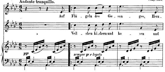 This is one of the 6 songs written by Mendelssohn titled “Auf Flügeln des Gesanges” (On Wings of Song) Op.34, with text by Heinrich Heine, one of the most acclaimed poets of the 19th century and also a friend of Mendelssohn.