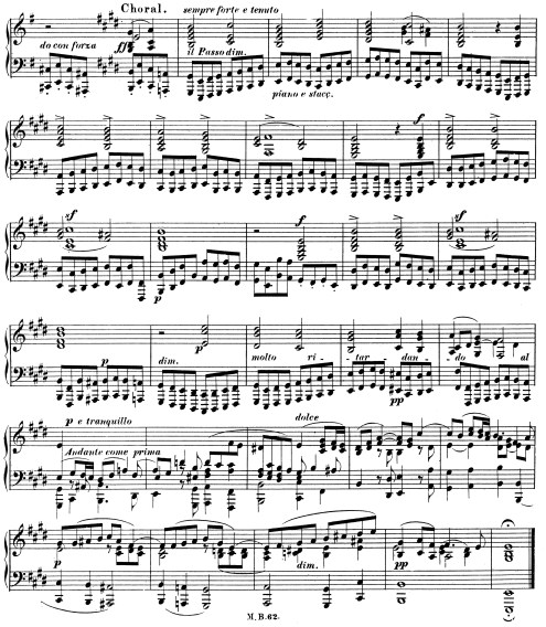 For instance, in the Prelude and Fugue Op.35 No.1 in E minor (of six that he wrote from 1832 to 1837 existing aside from those separately written and published afterwards), Mendelssohn devotes his time writing the first part of the fugue “as he watched through the night by the bed of his dying friend, Hanstein, and describing the progress of the disease as it gradually destroyed the sufferer, until he made it culminate in the chorale of release in E major” as found in the Ex.1.